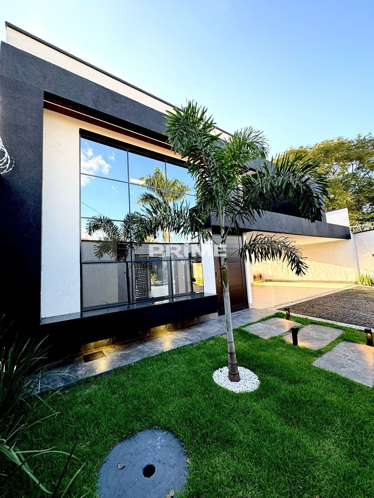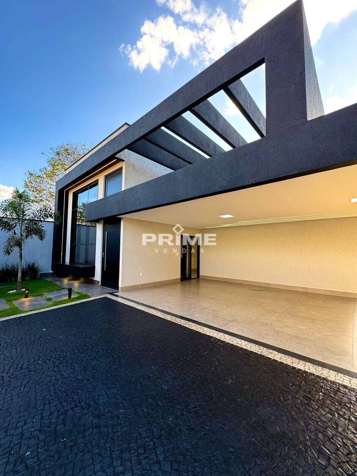 • Fachada moderna com vidro espelhado e pergolado.
