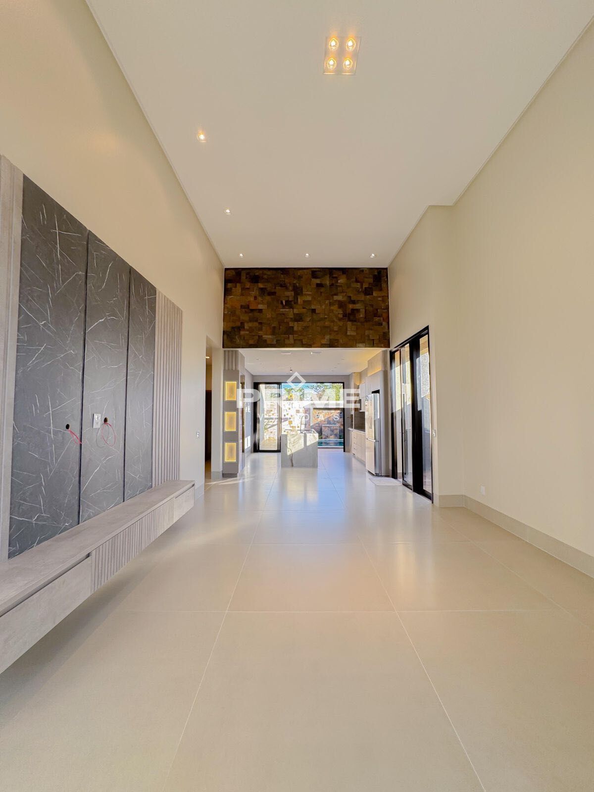 Sala de tv integrada com pé direito duplo já com painel
